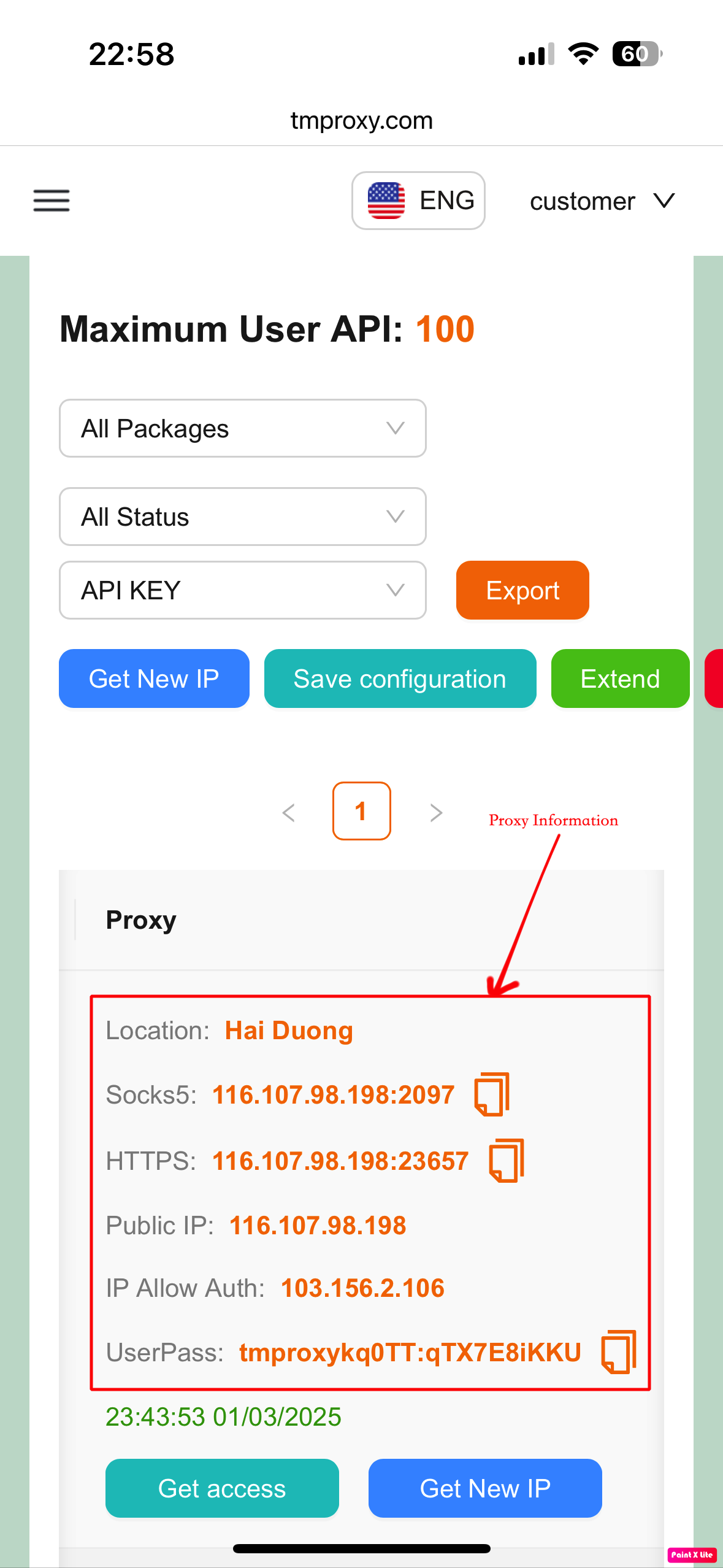 - Paste the proxy information you just obtained into the corresponding boxes. Then click “Save”.