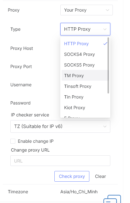 - Tích hợp proxy linh hoạt: Hỗ trợ nhiều loại proxy bao gồm HTTP, SOCKS4, SOCKS5 và TM Proxy — cho phép kết nối trực tiếp với TMProxy.