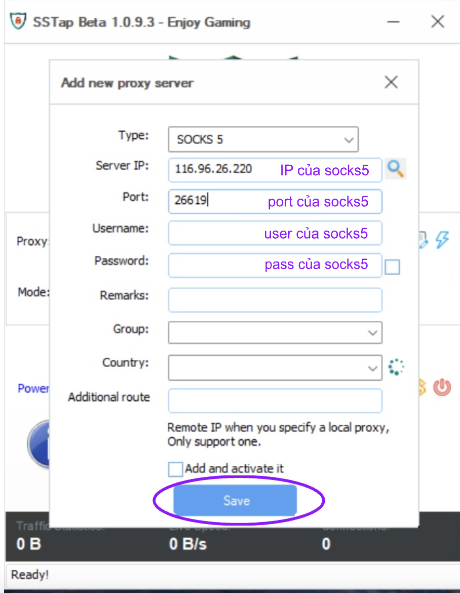 Bạn click vào dấu (+) để thêm socks5 mới vào nhé. Khi đó ta sẽ được giao diện như sau: